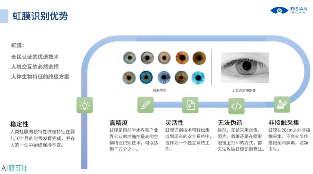 下面我们来看一下虹膜识别的优势,这里总结出了五条优势,如下图,详细讲解请观看视频回放: