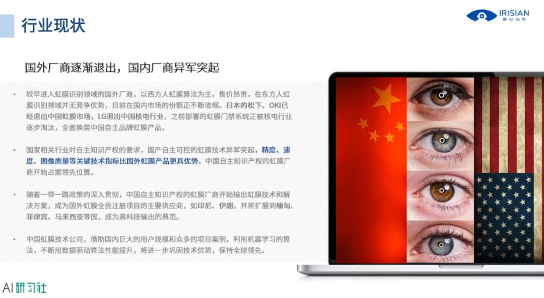 接下来看一下整个行业的现状,国内拥有自主知识产权的虹膜识别公司最早都是学术机构,上海聚虹的核心研发团队来自上海交大图像所和香港理工大学,融合了两岸顶尖的虹膜识别技术人才,详细讲解请观看视频回放:
