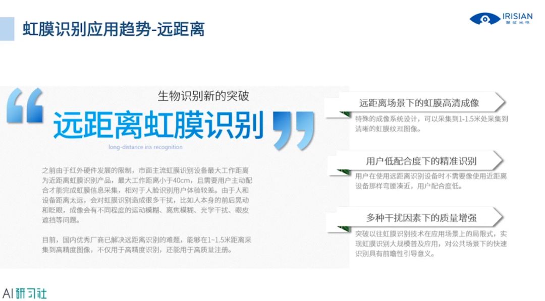 我们再来看第三部分,虹膜识别的应用趋势及技术难点,第一个虹膜识别的应用趋势是远距离。虹膜在最早诞生的时候,成像距离是非常近的,大约只有十几到二十厘米的作用距离,最大距离也只有三十到四十厘米,而且需要用户非常配合虹膜识别的采集过程,所以用户的体验并不是很好,在整个识别过程中侵犯感比较强,从而也对虹膜识别的采集以及虹膜识别技术的推广造成影响。详细讲解请观看视频回放: