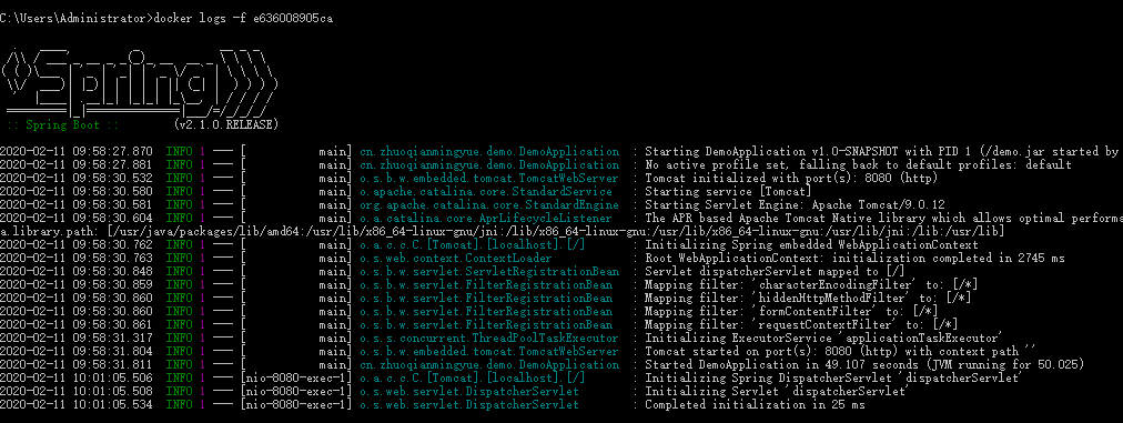 通过 docker log -f 容器ID 查看 SpringBoot 项目启动日志,具体操作如下图。