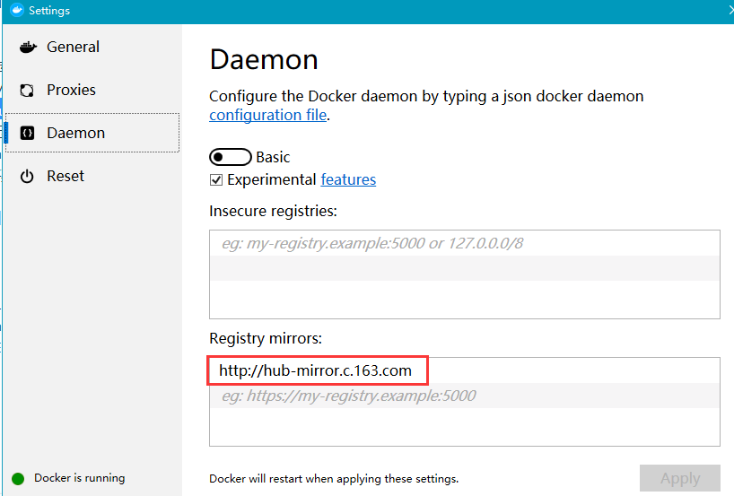 点击任务栏中docker图标然后点击 Settings 后如下图所示配置镜像加速地址