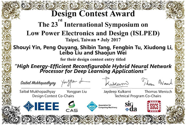 7月25日,清华大学微纳电子系可重构计算团队设计的可重构混合神经网络计算芯片(代号Thinker)在台北举办的2017国际低功耗电子学与设计会议(2017 ACM/IEEE International Symposium on Low Power Electronics and Design,简称ISLPED会议)上获得设计竞赛奖(Design Contest Award)。Thinker芯片第一完成人微纳电子系副教授尹首一和微纳电子系微电子与固体电子专业2013级博士生涂锋斌在会上详细介绍了该团队人工智能芯片的高能效设计技术。这是中国大陆单位首次以第一完成单位获得此奖项。