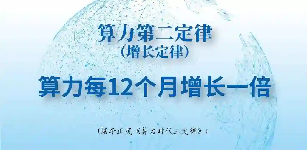 算力第二定律,即增长定律:算力每12个月增长一倍。受底层技术融合发展及加速成熟,尤其是5G以及物联网的大规模部署使得算力应用的范围大幅度增加,尤其是基于人工智能算法的智能业务正在从互联网行业开始向交通、工业、金融、政务等传统行业加速渗透,应用场景也从通用场景进一步拓展到行业场景,特别是在数字经济、数字社会和数字政府领域中得到了广泛的应用。在此过程中,算力资源增速显著,尤其是智能算力增速迅猛,已经打破“每隔18个月芯片性能可提升一倍”的摩尔定律,而由英伟达首席执行官黄仁勋提出的“黄氏定律”则预测 GPU 将推动 AI 性能实现逐年翻倍;赛迪研究院也预测2025年AI算力将成为绝对的主流。此外,随着元宇宙的技术成熟与应用场景拓展,算力资源的需求将进一步增大,将推动算力规模呈现出爆发式增长态势。因此综合当前发展态势与未来趋势分析,预计算力每12个月增长一倍成为新的规律。