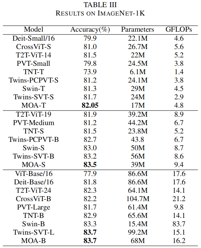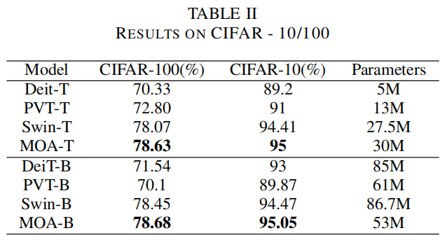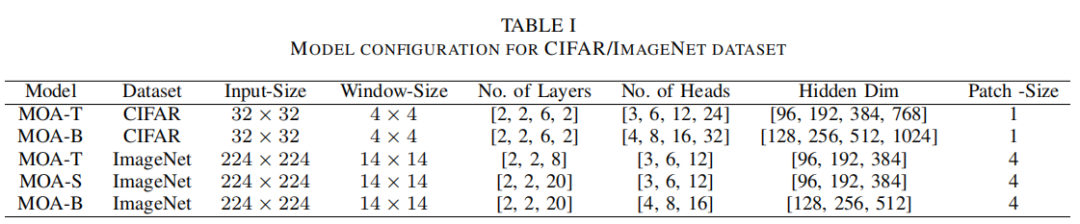 表1显示了CIFAR和ImageNet数据集的架构配置。在基于CIFAR的模型中,MOA-T和MOA-B包含相同数量的Transformer层:12层,但隐藏层维数不同。在基于ImageNet的模型中,MOA-T和MOA-S的总层数分别为12层和24层,但隐藏层保持不变,而MOA-S和MOA-B的Transformer层数相同:24层,对比隐藏层分别为96层和124层。