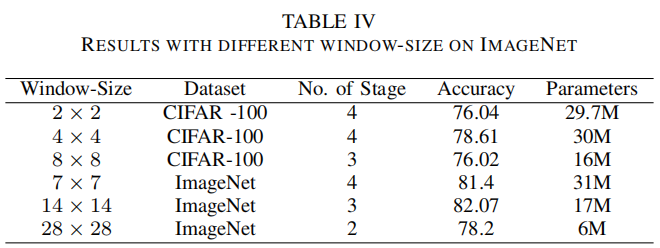 作者在模型中实验各种window size,发现4 x4和14 x14 window size适用cifar-100和ImageNet数据集,分别如表4所示。此外,删除window size大于的阶段特征图大小显著降低参数的数量。