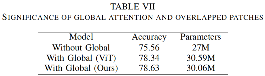 为了验证重叠和较大的key-value patches的效果,作者对没有重叠patches的模型进行训练并比较结果。此外,还进行了一个实验,在每个阶段之间不使用全局注意力来验证全局信息交换的意义。从表7的结果可以看出,包含全局注意力和重叠key-value patches的效果最好。