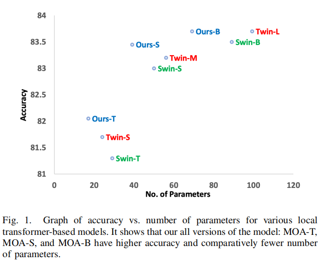 为了克服这些问题,作者开发了一个非常简单的模块,名为多分辨率重叠注意(MOA),以生成全局特征。该模块只包含乘法和加法运算,并在每个Stage后嵌入到下采样操作前的Transformer中。由于模块是在每一阶段后添加的,而不是在每一层Transformer后添加的,所以不会增加太多的计算量和参数数量。实验表明,将此模块的结果特征聚合到Local Transformer建立了长期依赖关系,因此与图1所示的参数总数相比,精度显著提高。