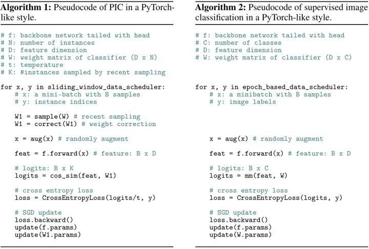 我们来对比一下 PIC 自监督学习和有监督学习的 PyTorch 伪代码,有2点需要注意: