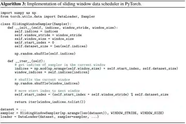 如下图所示是 Sliding Window Data Scheduler 的 PyTorch 伪代码,可以发现主要是构造了一个新的 PyTorch Sampler 的类。所以我们在附录1中简单介绍一下 PyTorch Sampler。可以看得出 Sliding Window Data Scheduler 本质上是附录1中的 Subset Random Sampler (子集随机采样)。