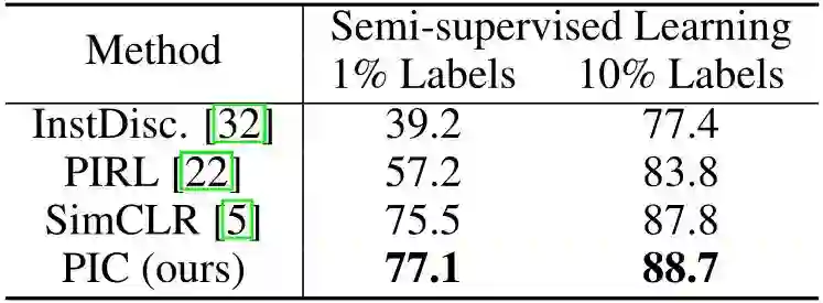 然后,作者将 PIC 与以前的最先进的方法进行比较,使用了更长的训练长度,即1600个 Epochs (相当于两个分支方法的800 Epochs 的训练)。PIC 在 ImageNet-1K 数据集上实现了70.8%的 Top-1 精度,明显优于 SimCLR (+1.6%),与 MoCo v2 (0.3%) 不相上下。