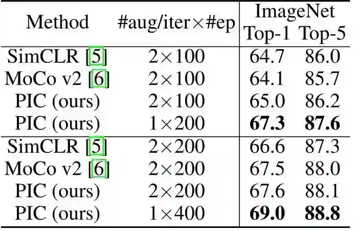 作者首先将 PIC 框架与先前的无监督预训练方法 (即 MoCo 和 SimCLR) 进行比较,在相似的训练长度下,不同的方法利用相同数量的 Augmentation view,如下图9所示。当使用200 Epochs augmentation views 时,PIC 框架在 Top-1 精度上分别优于 SimCLR 和 MoCo v2 2.6%和3.2%。使用400 Epochs augmentation views 精度增益分别为2.4%和1.5%。