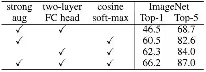 使用最常规的 SSL 策略会导致很差的性能,作者发现当使用了 cosine softmax loss + stronger data augmentation + 2-layer MLP projection head 这三项技术之后,SSL 的性能发生了显著的提升,如下图2所示是 ImageNet linear evaluation 实验结果。可以看出 cosine softmax 对性能的提升尤为重要。