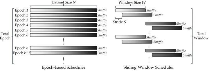 Sliding Window Data Scheduler 希望 "大多数图片的两次连续访问之间的距离的期望值为 。常规 Data Scheduler 每个 Epoch 里面都遍历所有训练数据。与之相反,Sliding Window Data Scheduler 在每个 Epoch 里面只遍历一部分图片 (一个 Window size 大小 的图片),到了下一个 Epoch 时,再遍历下一个 Window size 大小 的图片。下一个 Window 从前一个 Window 偏移。连续 Window 之间有重叠,重叠的图片占大多数,因此它们在相对较短的时间内被访问了两次。