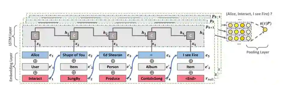 模型一共分为三层:在Embedding层对路径的每一个行为做embedding的计算。对于给定三元组,分别计算实体名称,实体类型和关系(或交互方式)的embedding后再拼接得到最终特征表示。LSTM层将路径上的每个单元的特征表示按照时间顺序输入并且将最后时刻的隐藏层状态作为该路径的特征表示。在pooling层,将所有路径的特征表示集合输入两层前馈神经网络,再对输出做带权重的池化操作得到最后的预测结果。