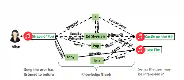 近年来如何将知识图谱融入推荐系统得到越来越多的关注,通过探索知识图谱中的用户到商品的路径,可以为用户与商品的交互行为提供丰富的补充信息。这些路径不仅揭示了实体和关系的语义,还能帮助理解用户的兴趣。然而现有的模型没能充分利用路径来推断用户偏好,尤其是在建模的顺序依赖关系和路径的整体语义方面。文章构建了知识感知路径递归网络模型(Knowledge aware Path Recurrent Network,KPRN),通过组合实体和关系的语义来生成路径表示。利用路径中的顺序依赖关系,可以基于路径进行有效推理,从而推断出用户-项目交互场景中的基本原理。此外,文章设计了一种新的权重池化操作,以区分用户与项目连接的不同路径的优势,赋予我们的模型一定的可解释性。下图为基于知识图谱的音乐推荐场景实例,虚线为关系,实线为用户-商品交互路径。