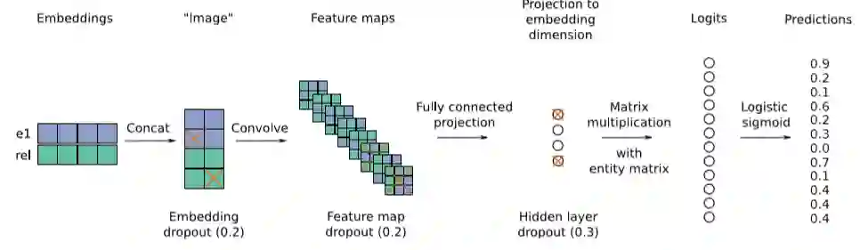 文章提出一种多层卷积神经网络模型用于知识图谱的链接预测任务。与自然语言处理中常用的一维卷积不同,文章通过把多个向量堆叠成矩阵,就可以像图形一样用二维卷积核来抽取embedding之间的关系。