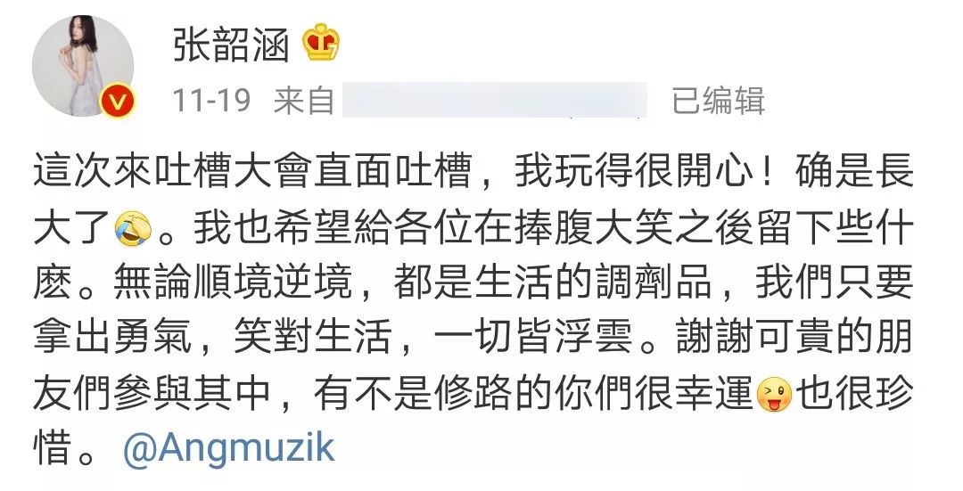 张韶涵表示自己很珍惜“不是修路的朋友” / 微博@张韶涵