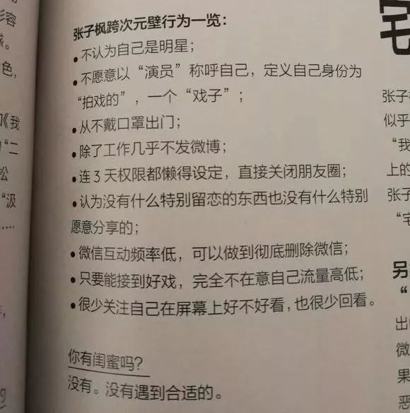 演员张子枫在一期杂志采访中,被问到“你有闺蜜吗”。