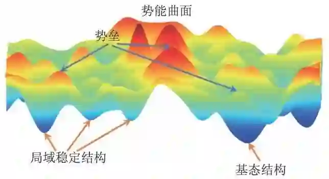 理论上,在给定物质的化学组分和外界条件以后,其所有可能结构与对应的能量构成了一个高维度的势能面(图3)。根据能量最低原理,物质通常以其能量最低的状态(即基态)存在,基态结构的能量处于势能面上的全局最小值点。因此,理论结构预测的目标就是在势能面上寻找到能量最小值点所对应的结构。物质的势能面通常具有高度复杂性和多维度性,对于晶胞具有N个原子的晶体,其势能面的维度是3N+3。这个高维的势能曲面是由一系列局域的能量低谷组成的,每个能量低谷的极小值点对应着局域稳定结构,它们之间由势垒分隔。具有相似结构特征的能谷通常聚集在一起,形成漏斗形的大能谷,代表不同结构类型的大能谷之间通常存在着较高的势垒。势能面上能量的极小值点数量巨大,并随着原子数的增加以指数方式增长,例如,具有13 个粒子的Lennard—Jones 体系,其势能面上的能量极小值大约有103个。当粒子数增加到55 时,极小值至少有1012个。理论结构预测就是在如此庞大的结构群里面找到全局能量最低的唯一结构,这是一个巨大的挑战,在现有计算条件下,通过遍历搜索势能面上的所有结构来确定基态结构是不可能的。也正因为如此,1988 年John Maddox (《自然》杂志社的主编)在《自然》期刊上发表社论说:“物理学的重要挑战之一是只根据化学组分来确定物质的结构”。
