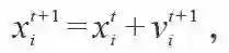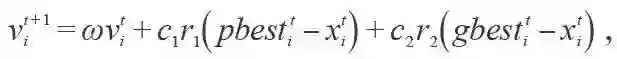 其中xit 代表第i 个粒子在第t 代的位置,其在t+1代的速度vit+1可以通过粒子前一代的位置( xit )、当前最优的位置( pbestit )、整个种群中最好的粒子的位置( gbestit )以及粒子上一代的速度(vit )计算出来,具体的表达式如下: