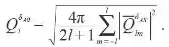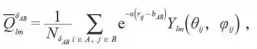 其中rij表示由原子i 指向j 矢量的长度。θij,φij是rij在极坐标下的方位角,A(B)表示第i( j)个原子种类。Ylm 是球谐函数, NδAB表示A与B元素成键的数目,bAB表示每种成键的最短长度,α是一个可调参数,为了消除坐标依赖,将这个矩阵用转动不变的形式进行表示: