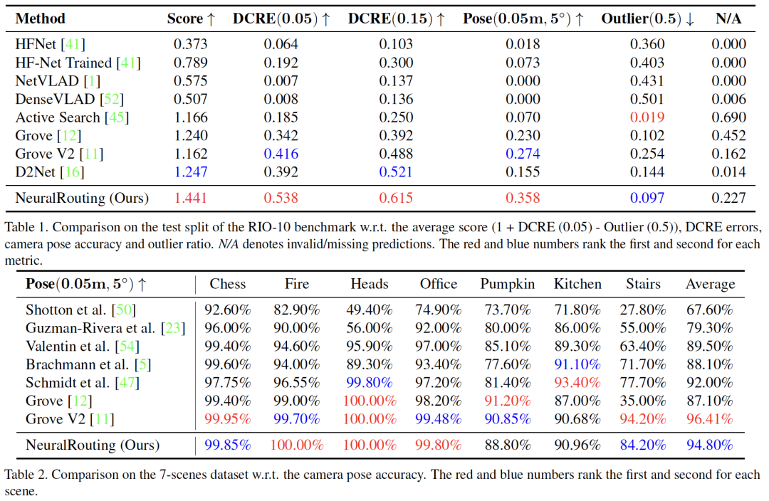 RIO-10和7-Scenes数据集的实验结果,红色标注最优,蓝色标注次优