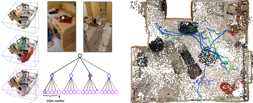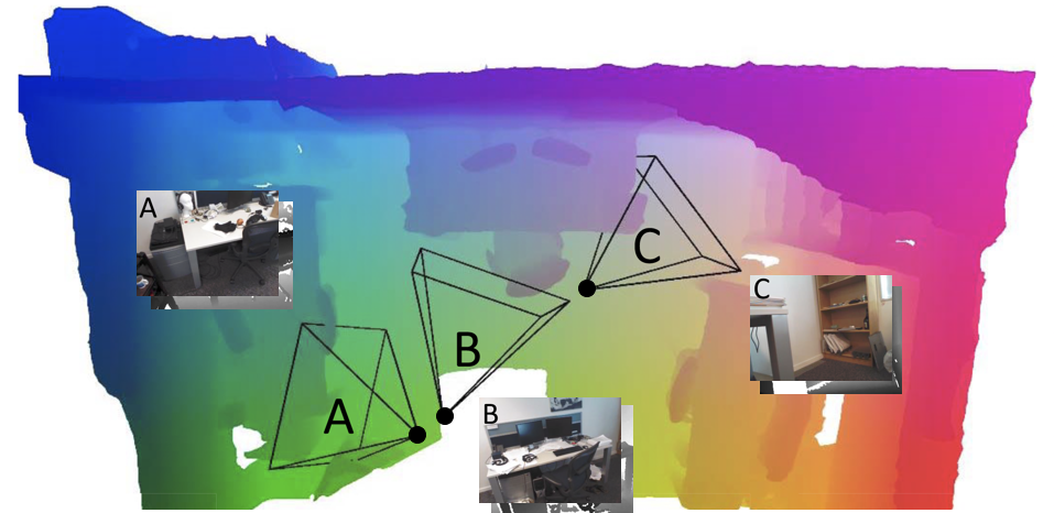 相机重定位研究在已知环境中根据 RGB-D 图像推算相机的位置姿态,是实现场景建模、增强现实、机器人导航等技术的基础。近年来,最先进的研究工作通常 (A) 先记忆和推测所观测到不同对象的位置;(B) 再通过这些对象位置的相对关系反算自身位姿。对于 (A),被观测对象的位置信息通常表示为图像像素坐标和场景世界坐标之间的对应关系(2D/3D-3D correspondences),使用决策树、神经网络等机器学习模型实现;对于 (B),通常表示为局部坐标系与世界坐标系之间的刚体变换,使用 Perspective-n-Point、orthogonal Procrustes 等非机器学习算法求解。