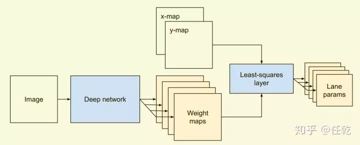 该网络的两个部分区分的很明显,一个“Deep network”负责给像素打上权重值,另一个“Least-squares layer”负责拟合车道线参数。所以这一部分没太多好介绍的。