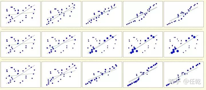 这张图里三色的点指的是像素,点越大代表权重越大,绿色直线代表ground-truth给的真值,黑色的直线代表网络估计的值。三行代表三种方式,每一行从左到右代表收敛过程。下面结合这种图分别说一下三种方式: