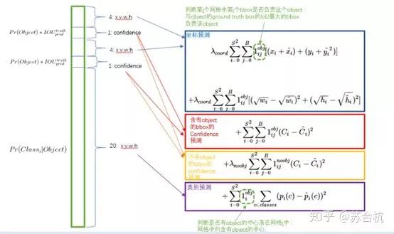 1.这里可以看出来,对于bbox的预测,如果grid cell,里面有object,那么示性函数为1,计入此项的loss(如果2个bbox中心点都在有object的grid cell里面,则取IOU较大的那个bbox,计算loss),如果grid cell没有object,那么示性函数为1则bbox的loss就不用叠加到总的loss上了。(ij表示第i个grid cell里面的第j个bbox)
