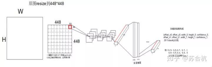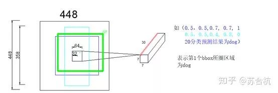测试图片resize之后,进入backbone,产生1个7*7*1024的feature map, 这个上面的一共有49个1*1*1024的tensor,每1个tensor对应resized image上面一个区域。将这个feature map过全连接,输出7*7*30的output,每个1*1*30的tensor,就对应resized image上面1个grid cell