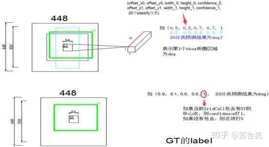 比如说output第2行,青色的5维信息,对应左图中青色的bbox,其中心点相对于grid cell左上角的Offset是32, receptive field的size64,所以第一个参数是0.5
