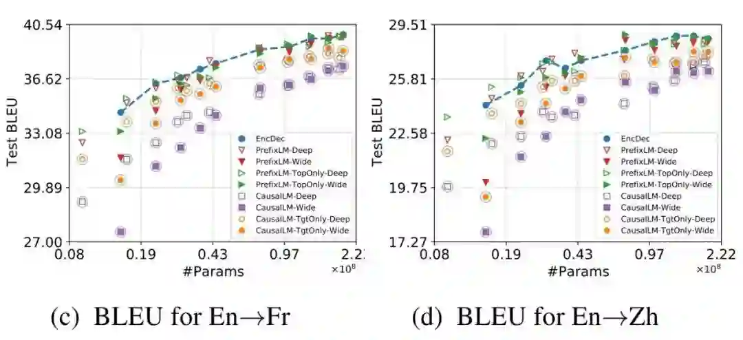 ▲ 这里列出本文最重要的实验图:在两个数据集上,各种LM变体以及encoder-decoder的BLEU分数-参数量曲线图。