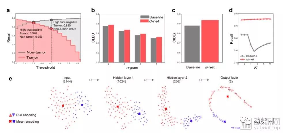 如上图,a、b显示的为全片肿瘤检测结果,c、d、e则为生成的“特征感知注意图”,对诊断细节进行描述。我们可以看到,针对每一张切片,系统在判读后,除了常规地将ROI区域框选出来,还针对不同区域生成了解释性文字。