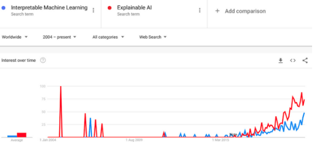 从那以后的几年,根据Google上「可解释性机器学习」和「可解释的AI」这两个搜索词的出现频率,可以大概得出IML领域在2015年才真正起飞。