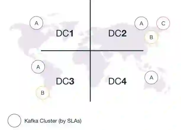 我们决定根据不同的服务级别协议(Service-level agreement,SLA)对 Kafka 集群进行分割。例如,在 CI/CD 管道和数据迁移案例中,服务级别协议是有别于生产服务的。请注意,由于每个数据中心的作用不同,并非所有数据中心都拥有同样数目的 Kafka 集群。