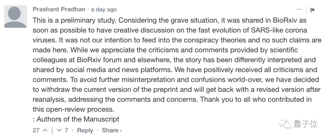 论文一公开就遭到了各种质疑,作者先是在论文下留言表示接受大家的批评,后来主动撤回了论文。