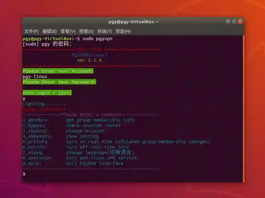 通过pgyvpn命令运行服务,根据提示登录账号后,无需任何配置,直接输入9,保持服务后台运行,退出蒲公英界面即可。