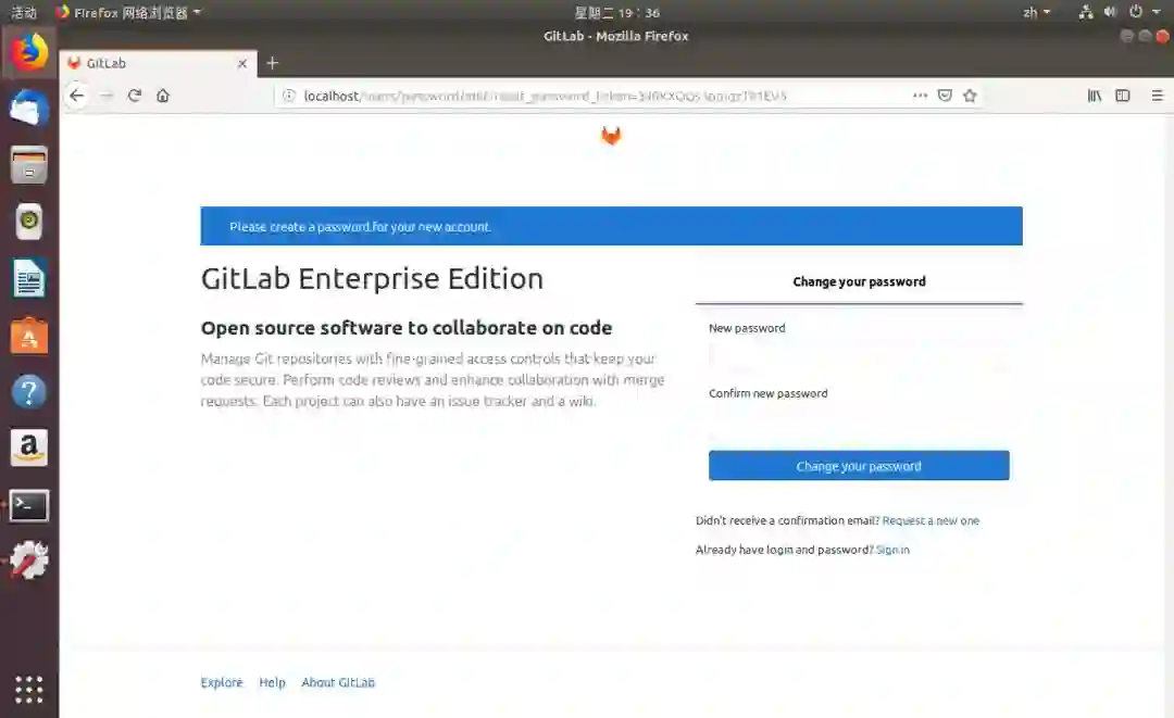 打开网页浏览器,通过本机IP进入GitLab的管理后台,完成初始设置。