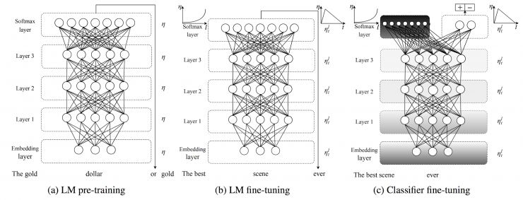 ULMFiT 的不同阶段(来源:Howard and Ruder, 2018)