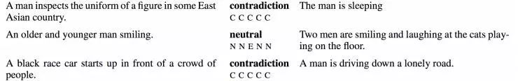 自然语言推理任务要求算法识别一段文本和一个假设之间的关系(蕴含、矛盾和中立)。斯坦福自然语言推理(SNLI)语料库是这项任务最受欢迎的数据集之一,它包含有 57 万对由人类书写的英语句子对。数据集的样例展示如下。