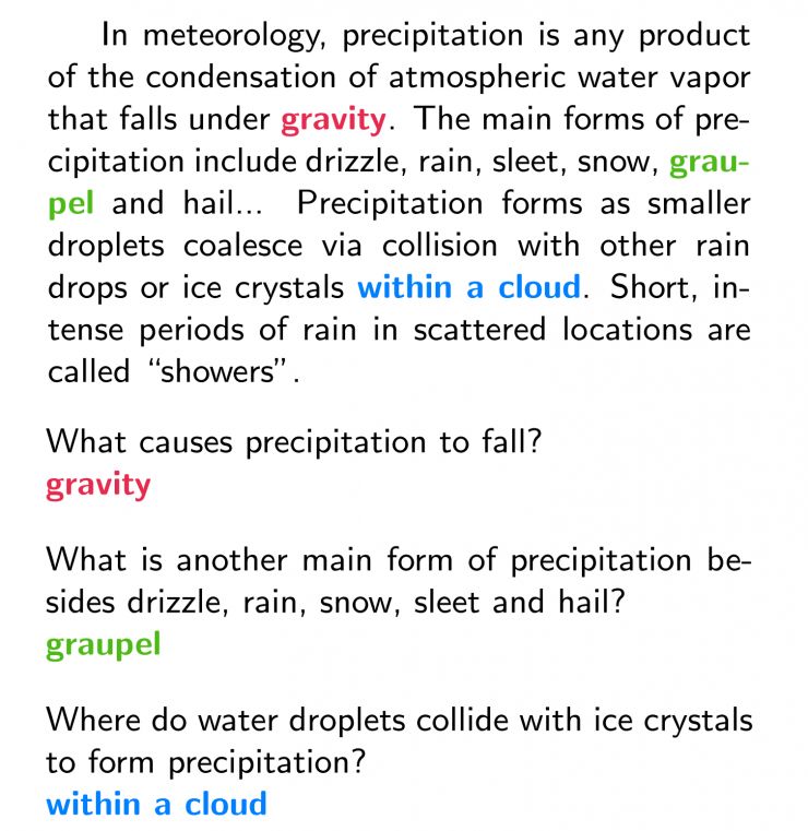 阅读理解是一项要求算法针对一段指定文本回答自然语言问题的任务。这项任务最受欢迎的数据集是斯坦福问答数据集(SQuAD),它包含有 10 万多对问答对(question-answering pairs),并且要求模型将答案在文本中进行高亮显示,如下图所示。