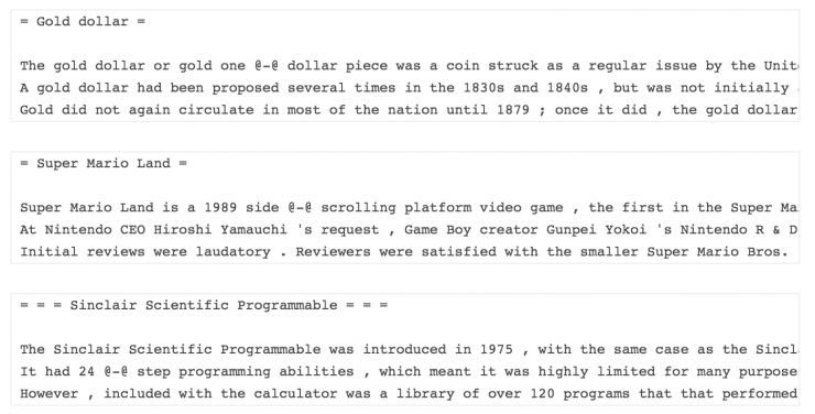 语言建模(Language modeling, LM)旨在给出当前单词的情况下,让算法预测出下一个单词。现有的基准数据集最多含有 10 亿个单词,但是由于该任务是无监督的,所以可以使用任意数量的单词进行训练。下图给出了 WikiText-2 数据集样例,它由维基百科文章组成。