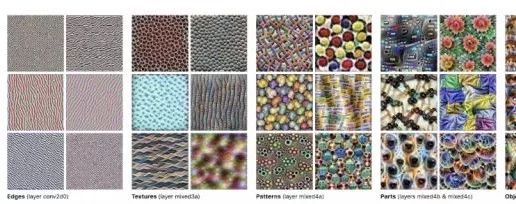上图可视化了 GoogLeNet 不同层的特征所捕捉到的信息,来自 ImageNet 上训练的 GooLeNet