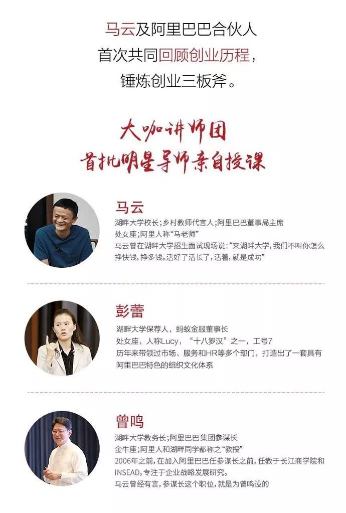 课程的分享者除了阿里巴巴集团董事局主席马云、湖畔大学教育长曾鸣教授 、阿里巴巴合伙人彭蕾等一众湖畔“金牌”老师外,还包括阿里巴巴合伙人、阿里巴巴走出的创业者们。