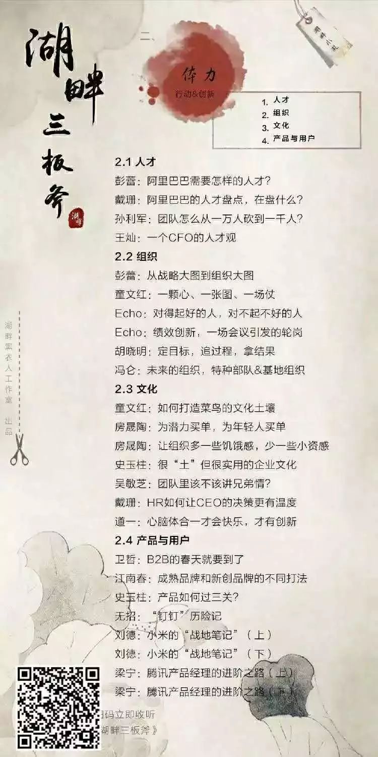 《湖畔三板斧》作为湖畔大学的开放平台,分享者除了梁宁之外,还有曾鸣、彭蕾等一众湖畔“金牌”老师,以及马云校长、阿里巴巴合伙人、阿里巴巴走出的创业者们。