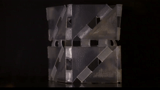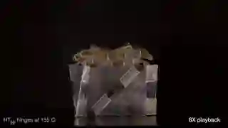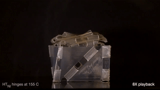 此外,他们还设计了一款可以自动折叠的正方体。正方体顶部铰链的响应温度为100摄氏度,当温度升高至100摄氏度时,顶层的铰链率先向内折叠。