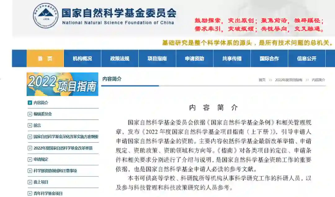 国家自然科学基金委员会依据《国家自然科学基金条例》和相关管理规 章,发布《2022年度国家自然科学基金项目指南(上下册)》,引导申请人 申请国家自然科学基金的资助。主要内容包括科学基金最新改革举措、申请 规定、资助政策、资助领域和方向等。《指南》对各类项目的定位、申请条 件和相关要求分别进行了介绍与说明,是国家自然科学基金资助工作的重要依据,也是国家自然科学基金申请人必读的参考文献。