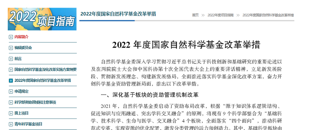 【导读】国家自然科学基金委员会在其官网上发布了2022年项目指南,内容科学基金最新改革举措、申请规定、资助政策、资助领域和方向等。《指南》对各类项目的定位、申请条件和相关要求分别进行了介绍与说明,是国家自然科学基金资助工作的重要依据,也是国家自然科学基金申请人必读的参考文献。