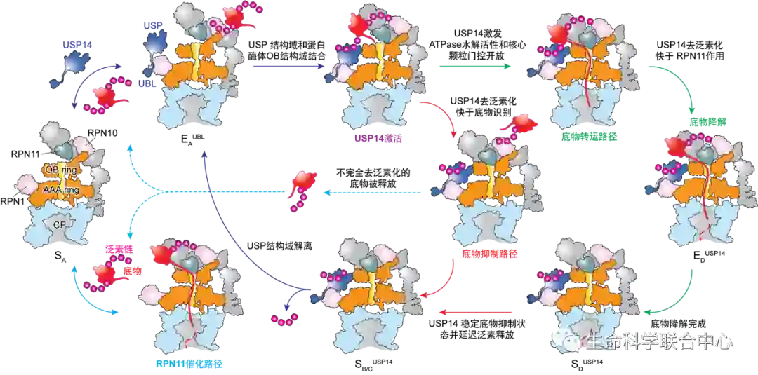 蛋白质降解调控是极其重要的基本生物化学过程,在细胞周期、信号转导、免疫响应、基因调控、新陈代谢、神经退行、癌症肿瘤、病毒感染以及蛋白毒性响应等主要细胞分子过程中发挥关键调控作用。在真核细胞中,绝大部分胞内蛋白都是通过泛素蛋白酶体途径(Ubiquitin-proteasome pathway),经过泛素化标记被蛋白酶体全酶降解的。2004年,Aaron Ciechanover, Irwin Rose和Avram Hershko三位科学家被授予了诺贝尔化学奖,以表彰他们对该泛素化通路介导蛋白质降解的历史性发现。蛋白酶体全酶,又称为26S proteasome,是由中间一个圆柱形20S核心颗粒和两端覆盖的一个或两个19S调节颗粒组成。19S包含一个环形异源六聚体马达——AAA-ATPase,通过多个协同ATP水解模式调控蛋白酶体降解泛素化底物。蛋白酶体功能紊乱与人体多种疾病相关,如癌症、神经退行性疾病和免疫疾病等。蛋白酶体是美国FDA批准的多种治疗癌症的上市小分子药物的直接靶标。在正常细胞中,蛋白酶体的功能受到多个水平的严格调控。去泛素化酶USP14是最主要的蛋白酶体调控分子,被认为是一个潜力巨大的治疗癌症和神经退行性疾病的重要靶标,其小分子抑制剂曾进入过美国一期临床研究,但围绕USP14功能机制的一系列悬而未决的关键问题极大限制了其靶向药物分子的开发和临床应用。USP14通过结合26S而被激活,然后以毫秒的时间尺度剪切底物上的泛素链。它是如何被蛋白酶体激活并调控蛋白酶体功能的,一直是全球研究机构和生物制药界期待解决的关键科学问题。